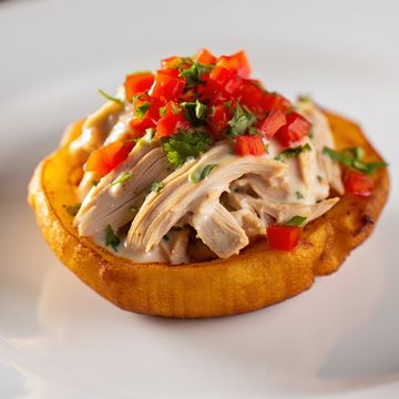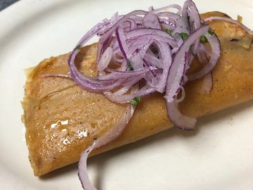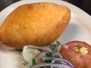 Fried stuffed potato filled with ground beef, raisins, olives, and egg