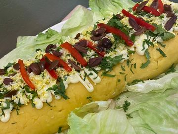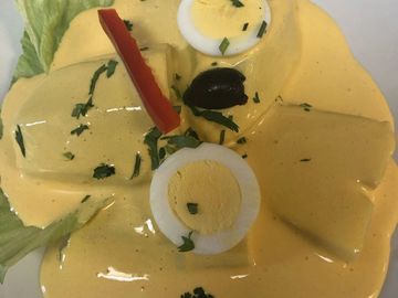 Sliced hard-boiled potatoes covered in Peruvian yellow pepper sauce