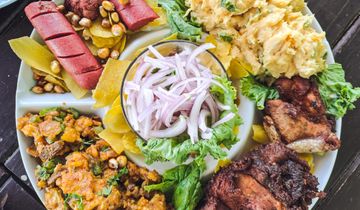 Fried tilapia topped with pickled onions. Served with sweet potatoes and boiled eggs.