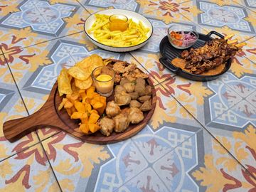 Fried pork served on a French roll with fried sweet potato and salsa criolla.