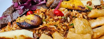 Spanish style rice with seafood, sausage, and chicken.